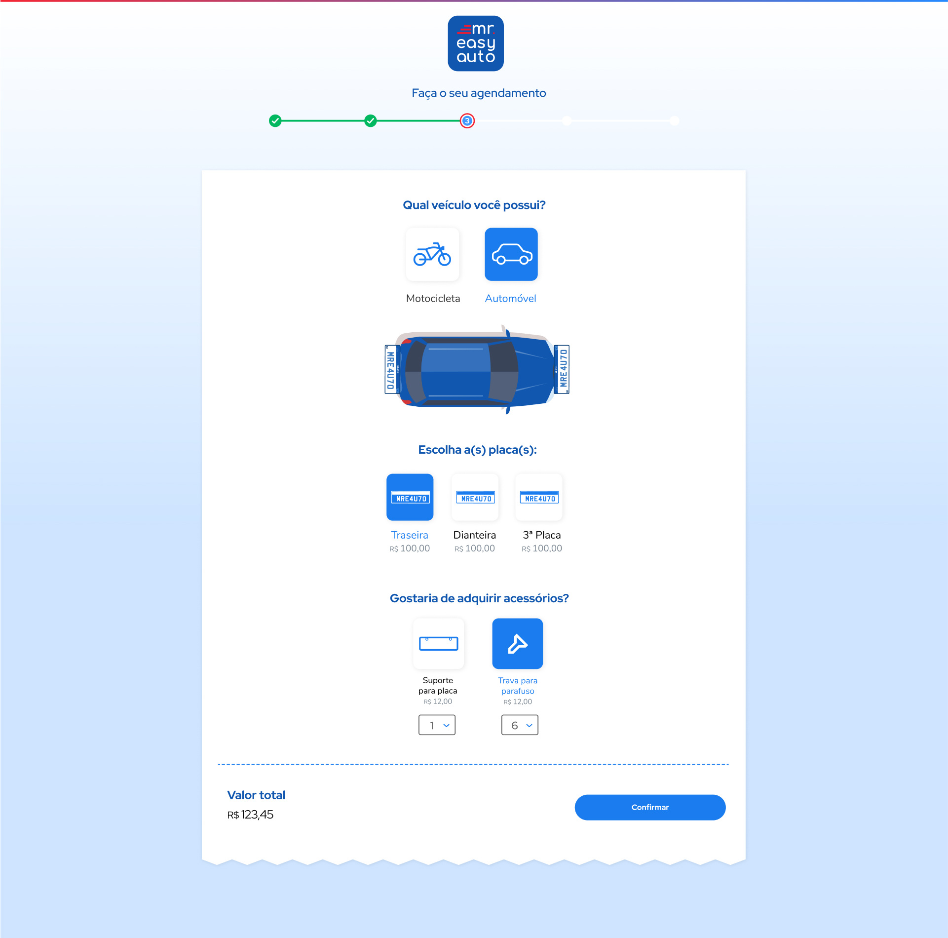 The client had a need to create a new scheduling platform for automotive services, specifically for exchanging license plates to the Mercosur model. The platform also required an admin interface for registering new members, managing appointments, and other functions.